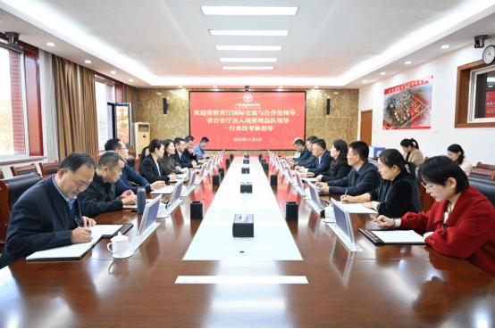 On the morning of November 4th, Gui Li, Deputy Director of the International Exchange and Cooperation Department of the Provincial Department of Education, and Liu Changjun, a Fourth-Level Senior Inspector of the Exit-Entry Administration Corps of the Provincial Public Security Department, came to the school to inspect the work on education for overseas students studying in China. Zheng Deqian, Secretary of the School Party Committee, attended the symposium, and Xu Xiaoyan, member of the Party Committee and Vice President, accompanied the inspection."